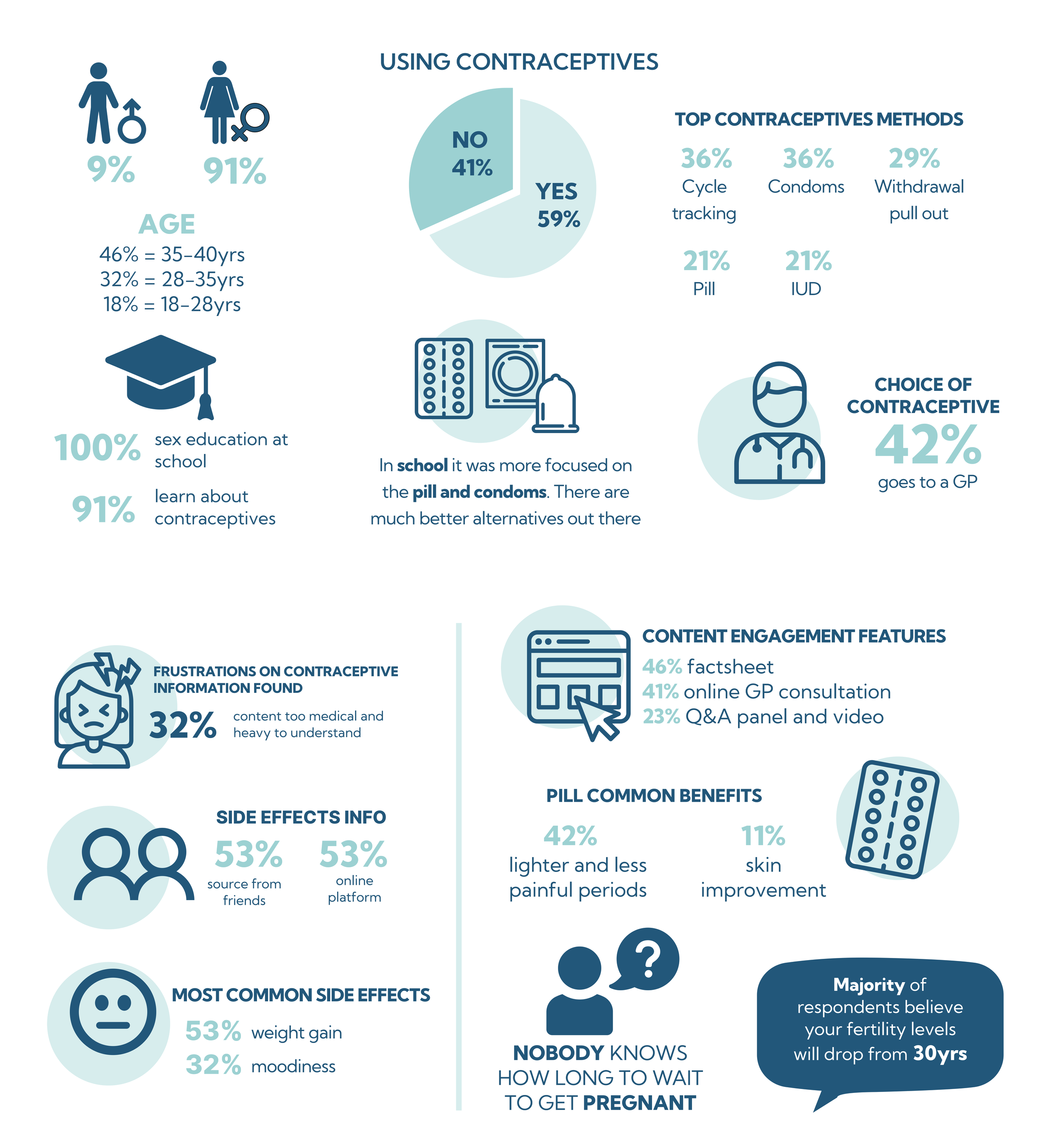 “Women feel frustrated with the lack of holistic information about contraceptives and the “one-size-fits-all” approach by many GPs. From our research findings a secondary statement emerged, which is: “Men feel detached from the contraception and fertility dialogue, and lack a supportive space for learning and discussion, especially with other men. The findings and opportunities to explore were categorised in the below.